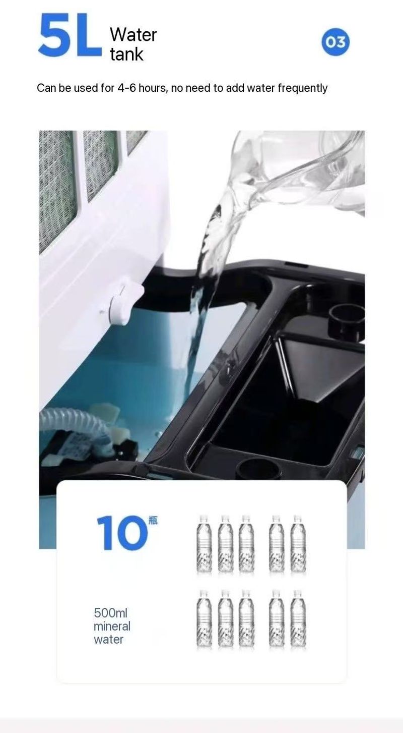 · Large 5L water tank: Provides long-lasting cooling, reducing the need for frequent water refills.